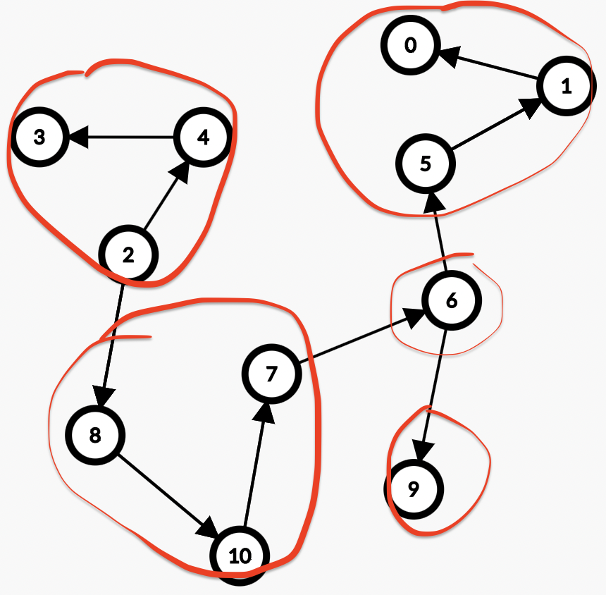- 한 scc에 속한 두정점 간에는 항상 경로가 있기 때문에,