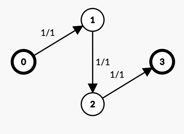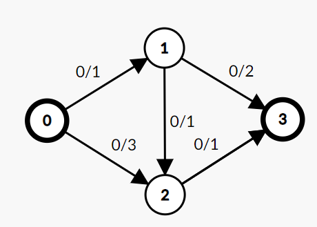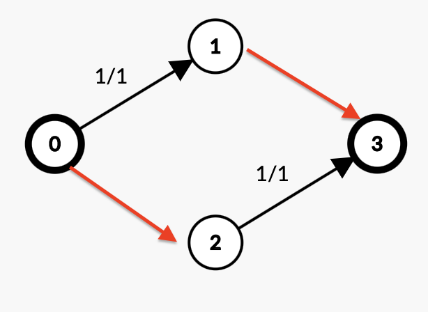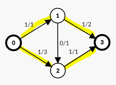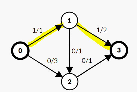 (위의 그림에서 0-1-3 에서 1-3은 2의 유량을 더 보낼 수 있지만 0-1로는 1의 유량만 보낼 수 있으므로 0-1-3은 최대 1의 유량만 보낼 수 있다.)
