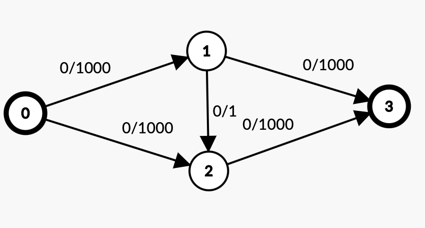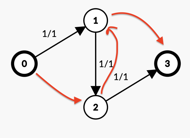 따라서 0-2에 1의 유량을 보내고 2-1에 1의 유량을 보내면 1-3에 1의 유량을 보낼 수 있게 된다.