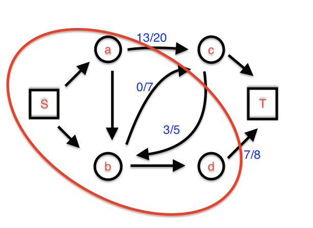 소스에서 잔여 용량이 있는 간선을 통해 갈 수 있는 정점들의 집합 S와 그럴 수 없는 정점 T로 정점의 집합을 나누는 것이다.