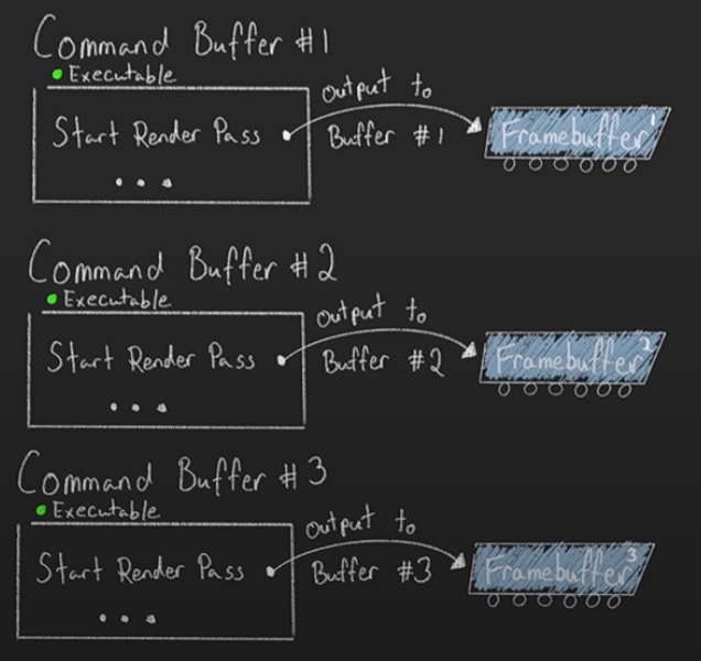 - drawing commands중 하나는 적절한 VkFramebuffer 과의 바인딩을 포함하고있기 때문에